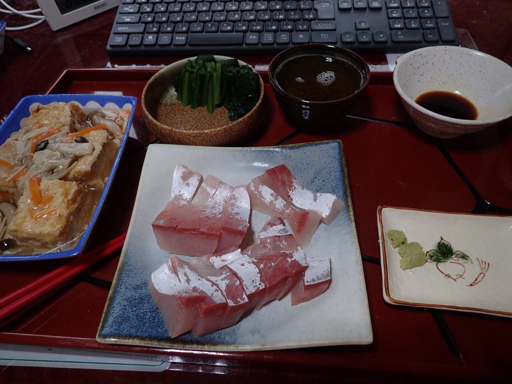 身の透明感の高い良い刺身です。前日に私が釣って死なせ方に失敗した57cmのヒラマサよりこっちの方がずっと状態がいいです。私みたいに欲張って変にご立派な絞め方をしたわけではなくて、単に水揚げした漁港で氷絞めされただけなんだろうと思います。絞めの技量で氷絞め如きに遠く及ばないとは・・・、我ながら泣けてきます。※ちなみに予想する水揚げ漁港は灘浦の佐々波漁港あるいは庵漁港です。